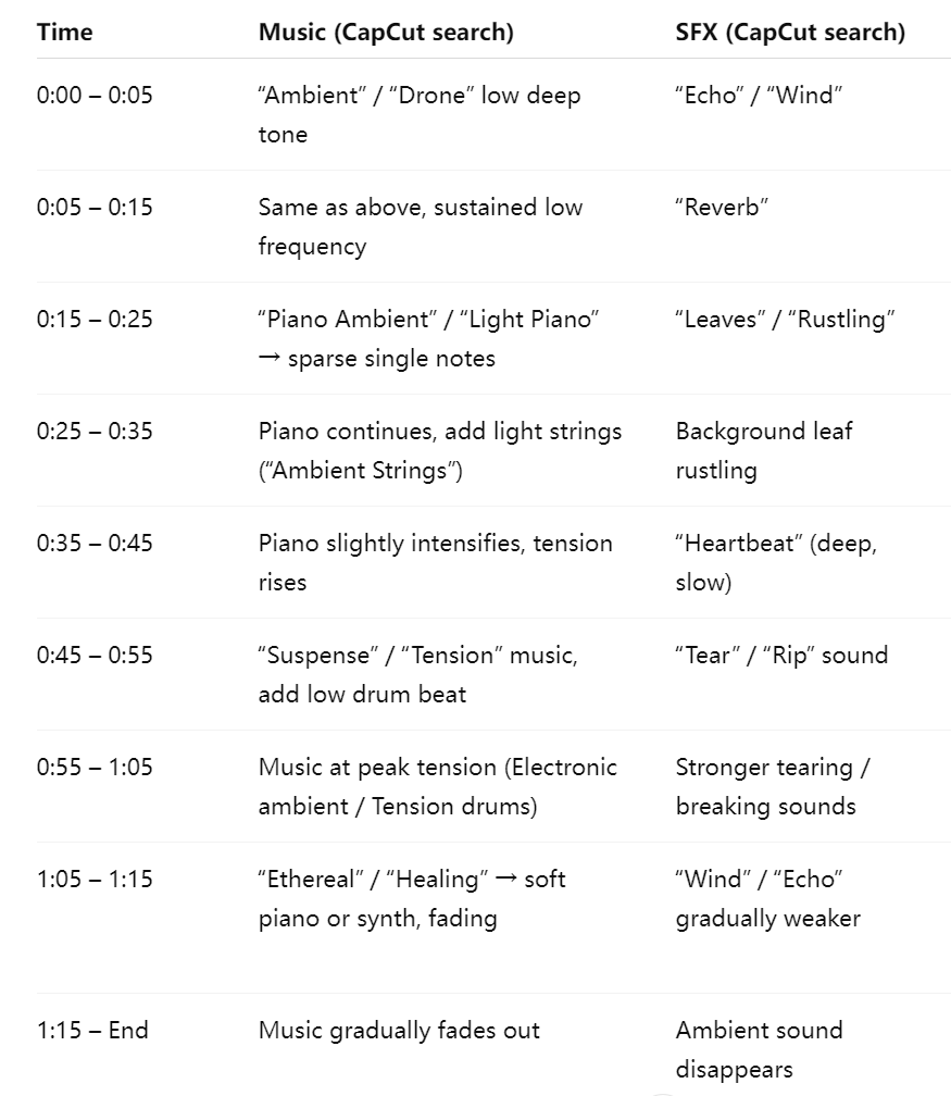 I especially enjoyed the sound part. I divided the video into sections and matched each one with different layers of music and sound effects. For example, I used low drones and echoing wind for the enclosed opening, soft piano and rustling sounds for the middle growth stage, darker tones and tearing noises for the climax, and fading echoes for the ending. This process taught me how sound can guide emotions and strengthen the atmosphere.