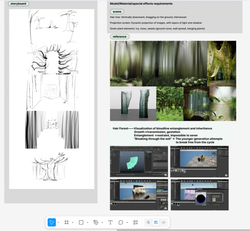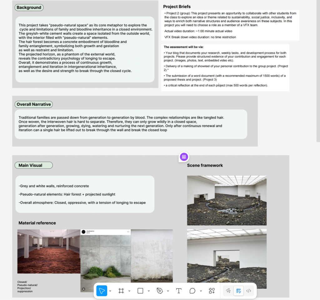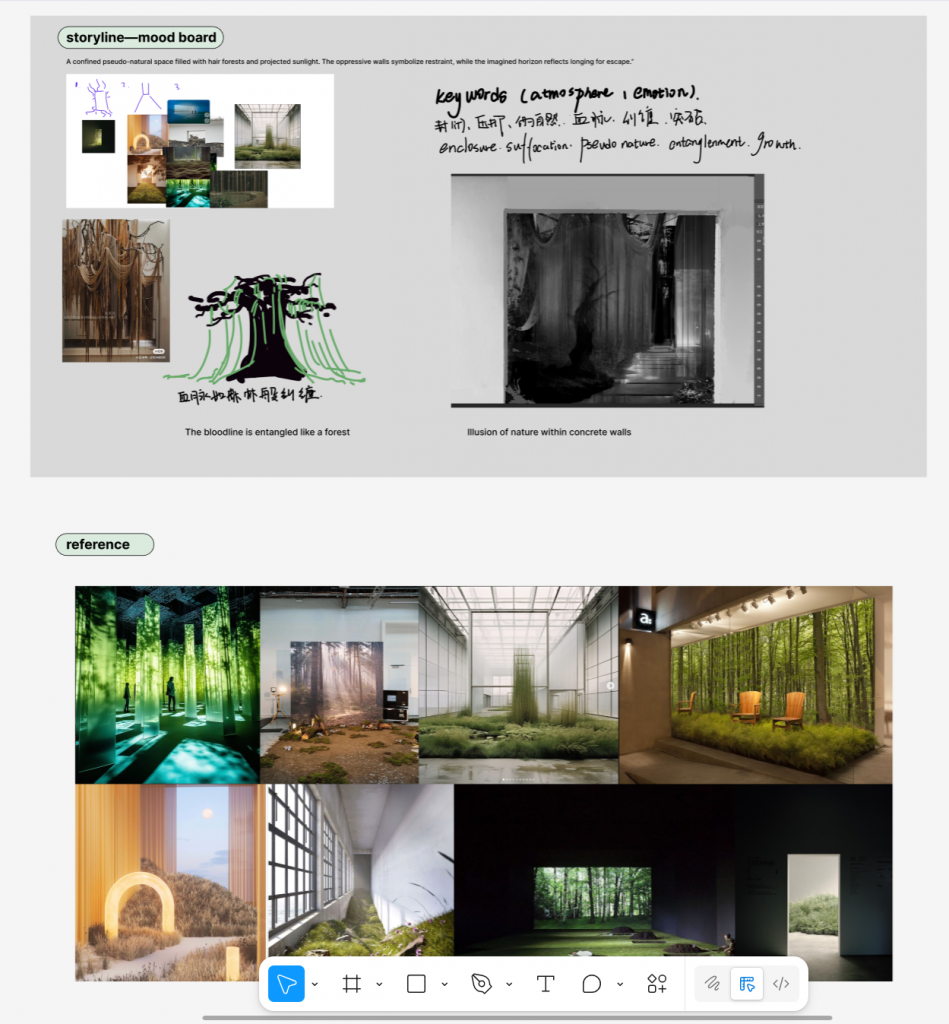 • Sketched simple scene references and drew several storyboard frames in Figma, to visualize how the camera might move through the pseudo-nature space